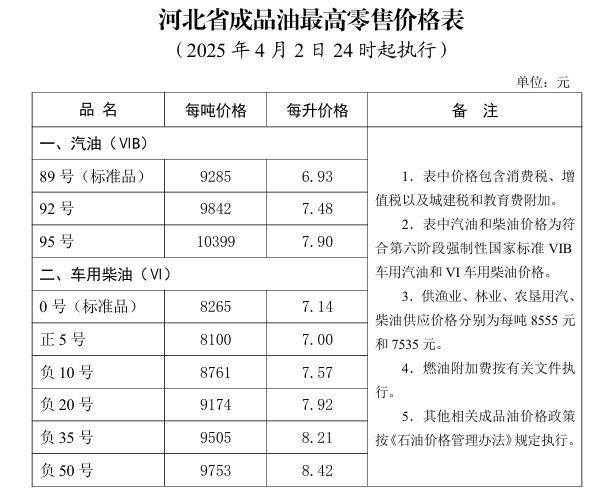 根据现行成品油价格形成机制,自2025年4月2日24时起,我省汽、柴油价格(标准品)每吨分别提高230元、220元,调整后的汽、柴油最高零售价格见下表。乙醇汽油价格按同标号汽油(VIB)价格执行,普通柴油价格按照同标号车用柴油(VI)价格执行,98号汽油价格由成品油生产经营企业根据市场情况自主制定具体价格。