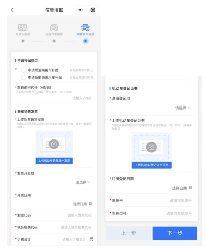 【购置新车信息】填报界面,选择申请补贴类型,包括燃油乘用车补贴或新能源乘用车补贴。填写新车“车辆识别代 号(VIN 码)”;上传新车的《机动车销售统一发票》,系统自动识别并带出机动车销售统一发票上的发票开具地、开票日期、发票代码、价税合计信息;填写“注册登记地”,并上传新车的《机动车登记证书》,系统自动识别并带出机动车登记证书上的注册登记日期、车牌号、车辆型号、排量信息。