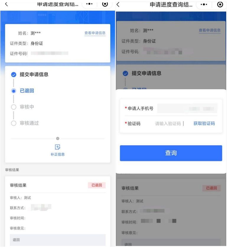 当受理地受理退回或审核退回时,可进行【补正信息】,输入手机号及验证码进入修改界面进行补正。补正后重新提交的信息,均需重新进入受理审核环节。