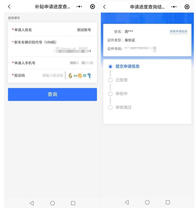 申请人信息提交成功后,通过【申请进度查询】,可查看受理审核进度,点击【查看申请信息】,输入手机号及验证码可查看补贴申请详细信息和受理审核结果,包括审核时间、审核人等。