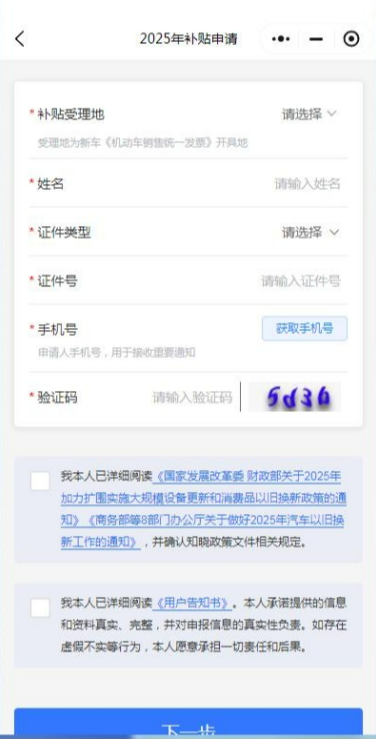 通过【2025 年报废更新申请入口】进入申请界面,首先是用户告知界面,包括实施细则和用户告知书,选择补贴受理地,点击【下一步】,填写申请补贴信息。