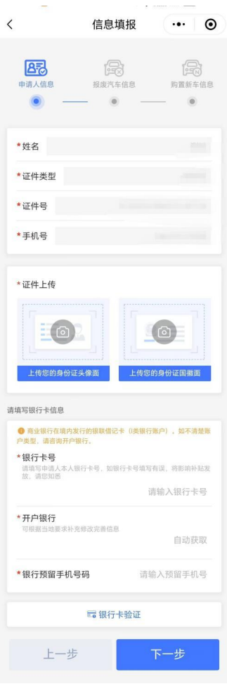【申请人信息】填报界面,填写申请人本人银行卡(商业银行在境内发行的银联借记卡,需为Ⅰ类银行账户)的开户银行、银行卡号、银行预留手机号信息,点击【下一步】,填写报废汽车信息。