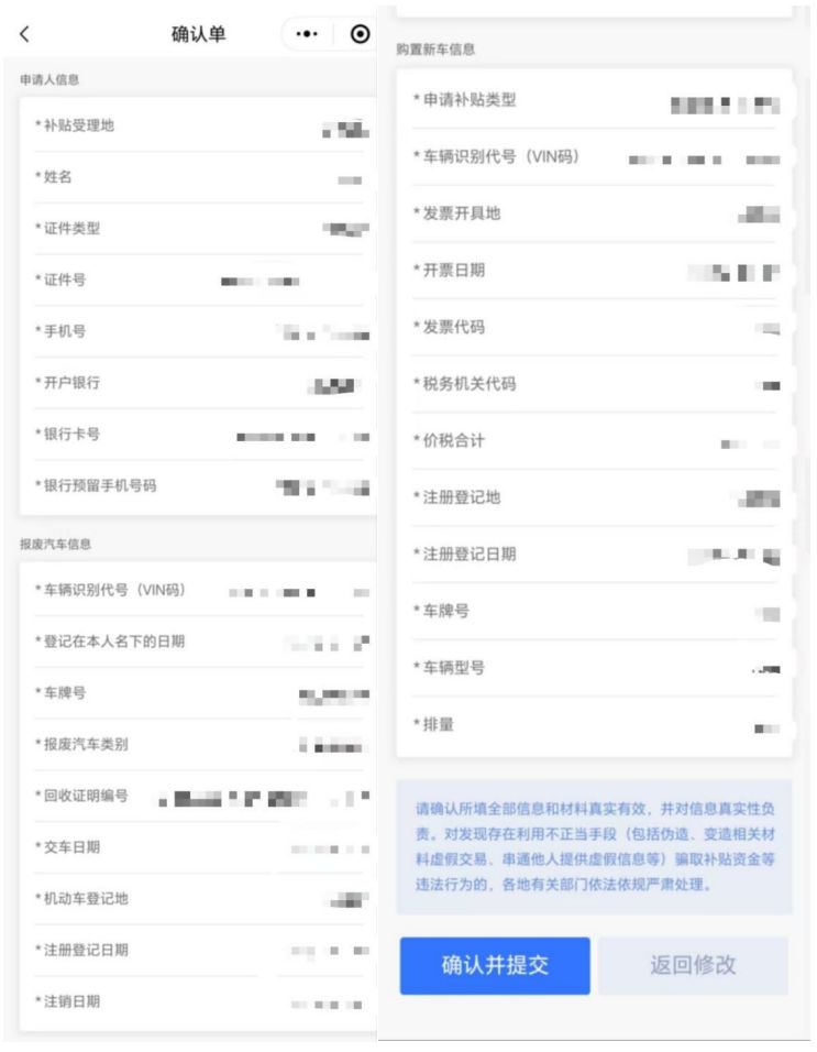 完成以上三步填报后,点击【下一步】对信息进行再次确认,若需修改,点击【返回修改】进行补正;确认信息无误,点击【确认并提交】,提交后完成汽车以旧换新补贴申请操作,进入受理审核环节。