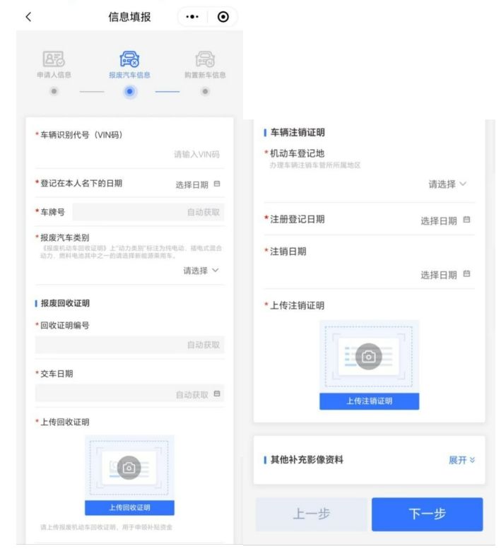 【报废汽车信息】填报界面,填写车辆识别代号(VIN码)、报废汽车类别,勾选“旧车登记在本人名下”日期,系统自动获取车牌号码、报废回收证明编号、交车日期信息;上传《报废机动车回收证明》。填写机动车登记地、注册登 记日期、注销日期,上传《机动车注销证明》;如有其他补充影像资料,可上传相关图片信息,点击【下一步】,填写购置新车信息。