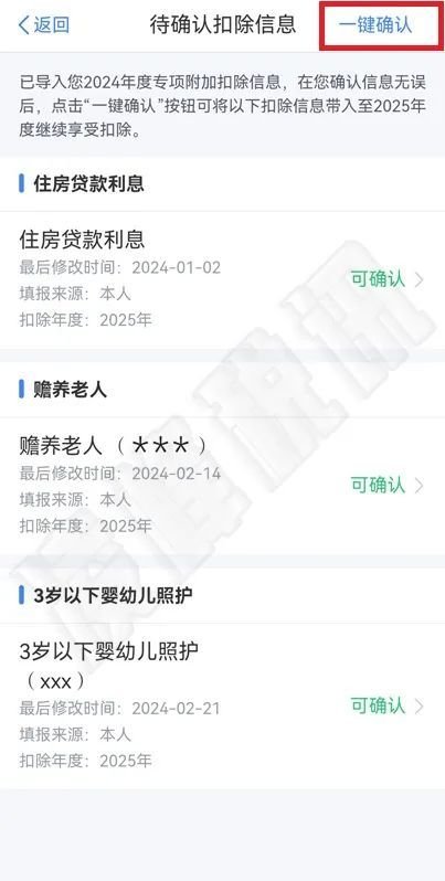 (2)若有需要删除、修改的待确认的专项附加扣除,点击【可确认】进入填报详情页面,在该页面可修改、删除待确认到2025年度的专项附加扣除信息(此处删除、修改的只是待确认到2024年度的专项附加扣除信息,不会真正作废或修改您在2024年度正在享受扣除的专项附加扣除信息)。如果删除某项专项附加扣除后,则该项删除的专项附加扣除不会确认到2025年度。处理完毕后,点击右上角【一键确认】。