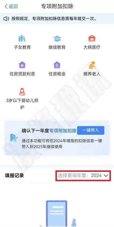 请在“专项附加扣除”功能界面(一键带入的下方),填报记录选择查询年度2024,查看2024年度是否填报了专项附加扣除。