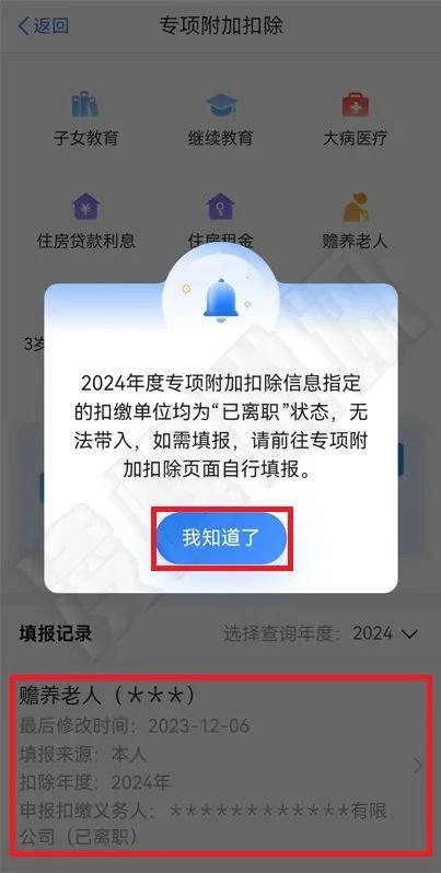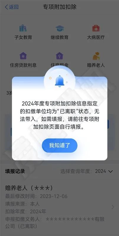 一键带入时提示“2024年度专项附加扣除信息指定的扣缴单位均为“已离职”状态,无法带入,如需填报,请前往专项附加扣除页面自行填报”