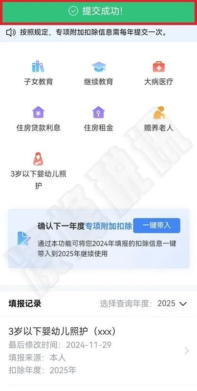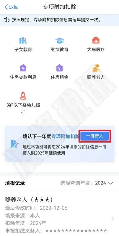 (1)若2024年度有符合填报条件的专项附加扣除没有填报或因误操作导致作废了已填报的专项附加扣除等情形的,可以先填报2024年度专项附加扣除后,再执行“一键带入”操作,将2024年度已填报的专项附加扣除确认到2025年度。