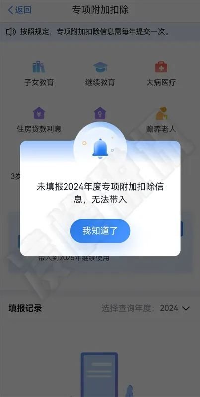 一键带入时弹框提示“未填报2024年度专项附加扣除信息,无法带入(如下图)