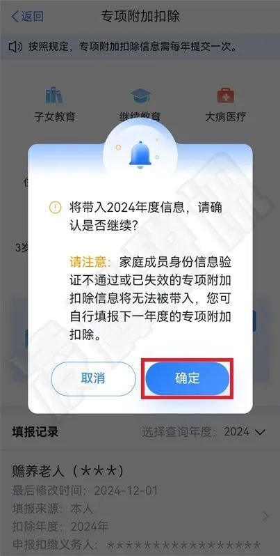 系统弹出“将带入2024年度信息,请确认是否继续”弹框,点击【确定】跳转到“待确认扣除信息”界面;