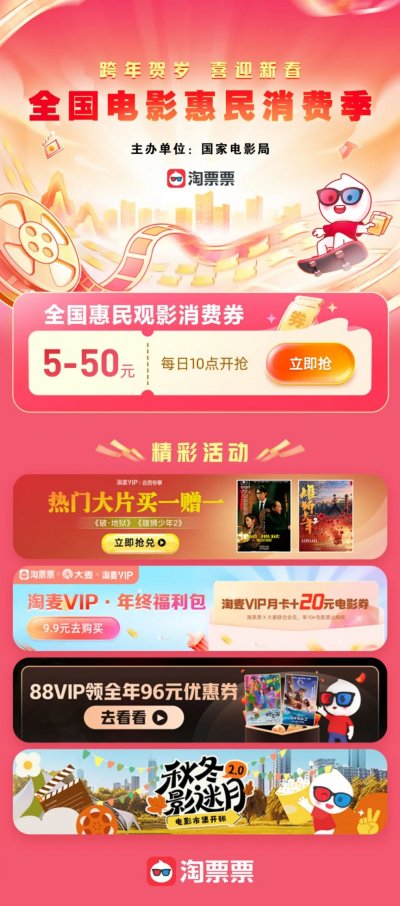 2024年12月9日至2025年2月28日,用户可通过淘票票App、微信淘票票小程序、支付宝淘票票小程序、淘宝淘票票小程序首页“全国电影惠民消费季”或“政府补贴”进入活动专题页领取5—50元红包,并且同时可享受淘票票买一赠一、淘麦VIP积分礼包、88VIP全年观影优惠券、影迷月活动。