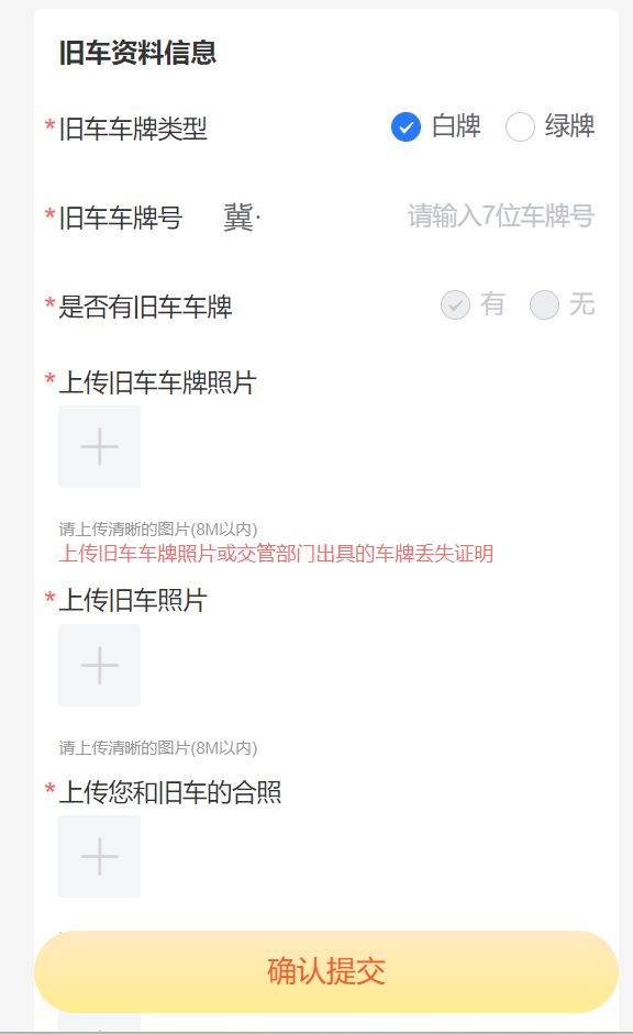 提交旧车资料,(选择旧车车牌类型填写旧车车牌号),上传相关照片。