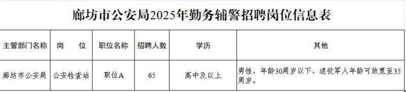 廊坊市公安局在2025年盛大招聘65名勤务辅警,这是一次难得的就业机会。以下是一些建议,帮助您准备应聘: